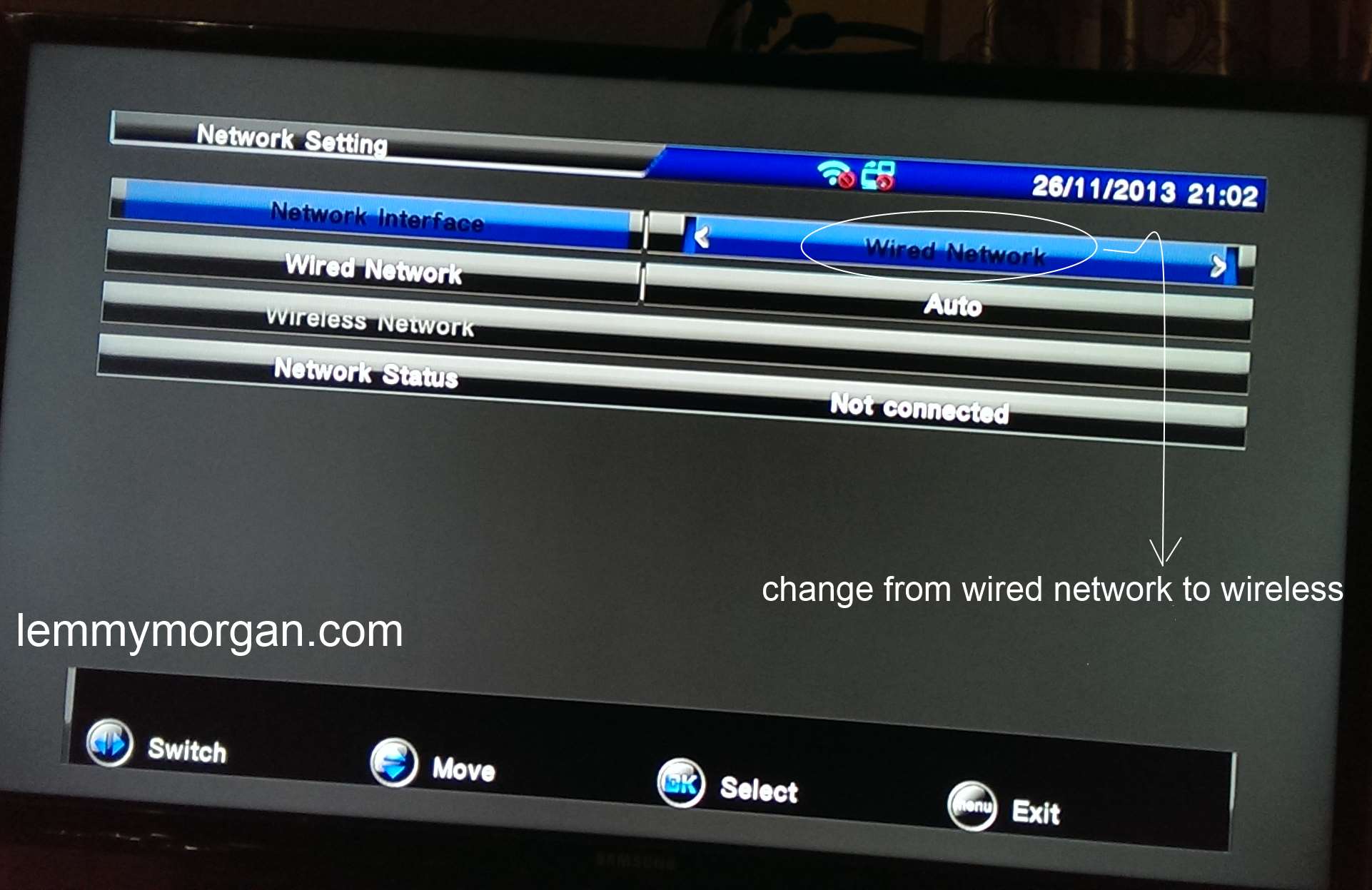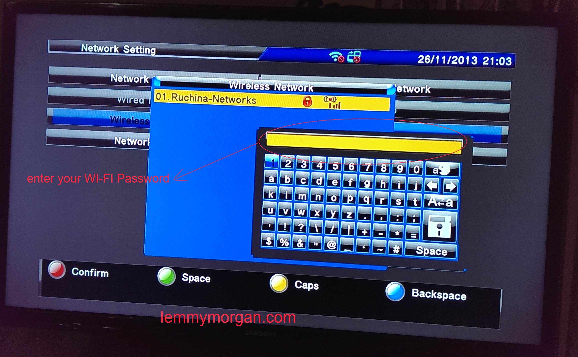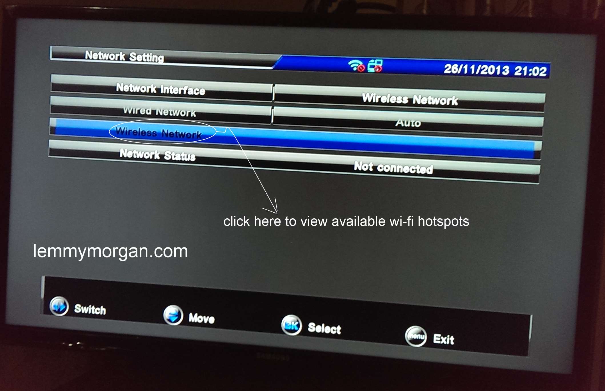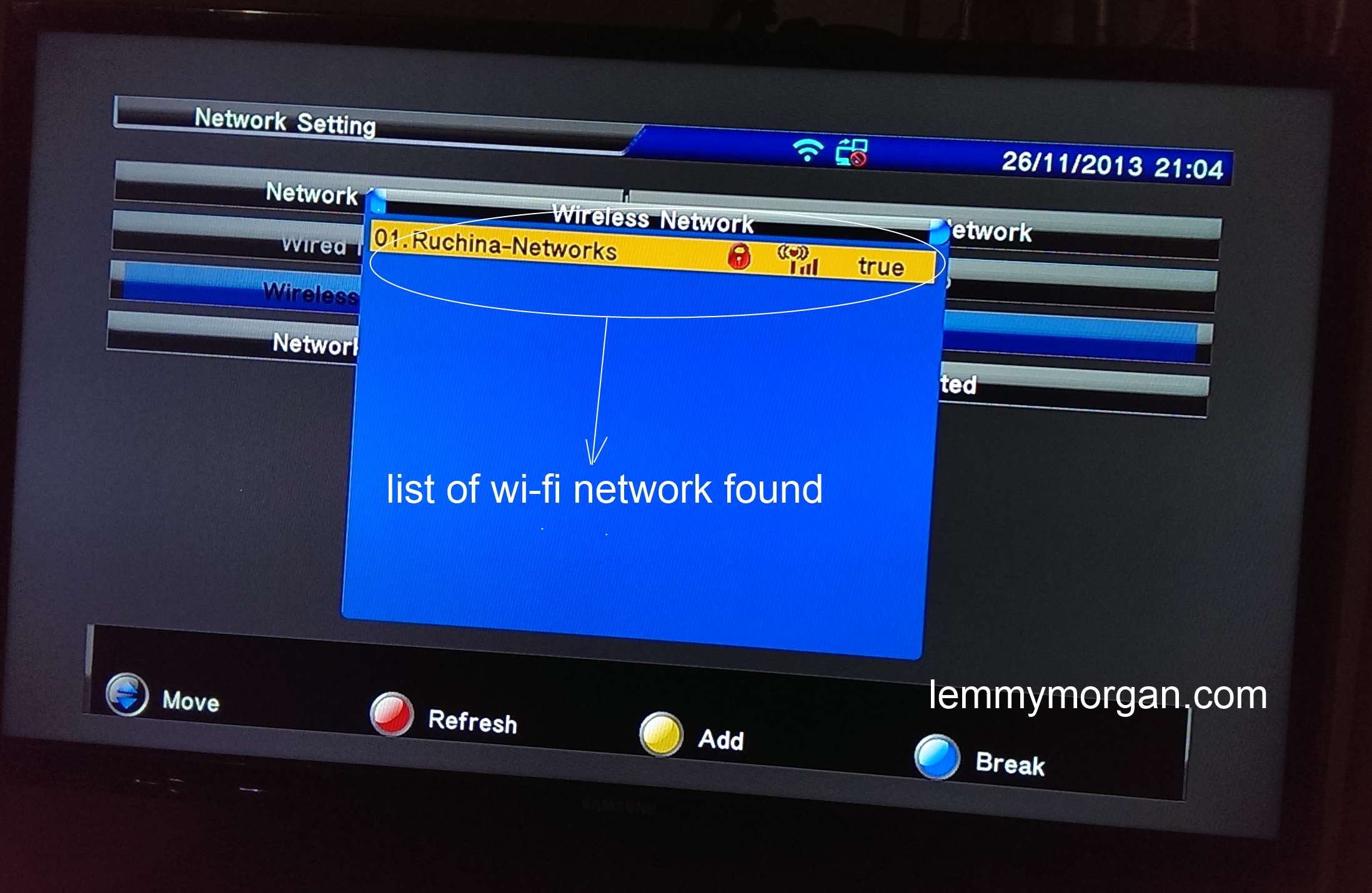 On your remote, navigate to Menu>>Multimedia>>Network Settings. Here you will see the network interface of G6, by default, it is set to wired network (meaning lan) you will have to manually change it to wireless network as shown below;The next step is for you to search for available wifi network as shown below am using connectify pro and i name my wi-fi hotspot Ruchina-Networks;