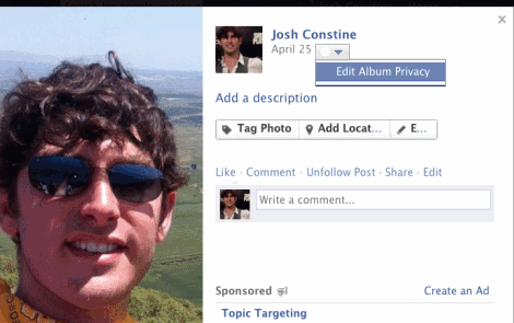 All your other albums beyond Profile Photos and Mobile Uploads will only have a cross-album privacy setting that applies to every photo inside. The “Edit Album Privacy” button seen in the screenshot below was how the Profile Photos album previously functioned as well.